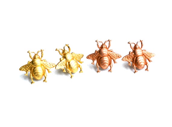 These nature inspired bee earrings are such fun! Rose gold or golden brass bee earrings are beautifully detailed. These little rose gold or golden brass bees are set on nickel free, surgical steel posts. Each little bee measures approx 18mm long or approx ¾ inch by ¾ inch.