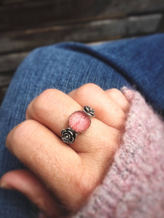 Elegant, boho and pink! This strawberry quartz ring with roses is definitely for those who rock the boho look! The quartz is 10 mm and the roses are 8 mm