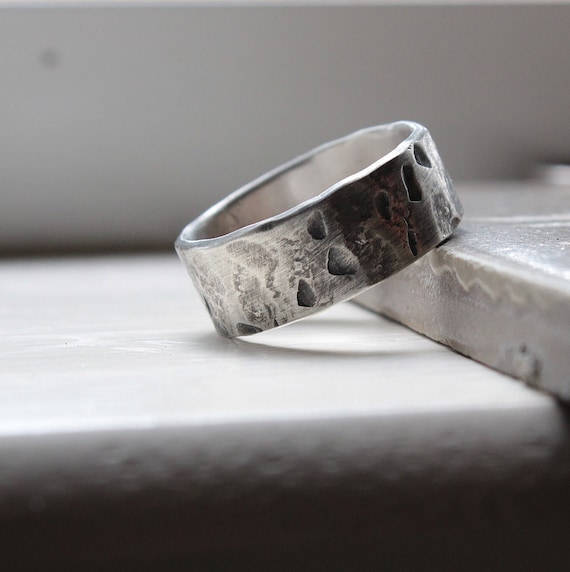 I made this ring from silver stock, cut, formed, forged and went at it with a couple of really old hammers that made this unique heavily distressed texture. The oxidation is down in the deep parts and the rest of the ring is slightly polished to bring out the fabulous texture. It’s a very comfortable ring.