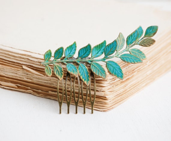 This is a beautiful green patina leaf hair comb. A perfect piece of hair jewelry for the bride, bridesmaids or any special occasion. A detailed leaf branch is securely glued to an antique style hair comb. I use Jewelers glue E6000. This elegant hair comb measures 3 ½ inches wide by 2 inches tall. The last two photos show a bride wearing three of these hair combs in gold. Please note - because the patina is hand crafted each leaf branch will have slight variations in the shades and coverage on the charm.